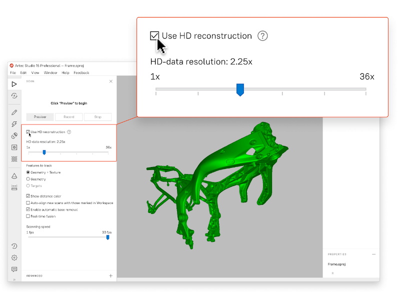 praćenje procesa skeniranja komada uz podešavanja samog skeniranja u smislu broja frejmova u sekundi, potrebne količine detalja, željene brzine rada, itd.