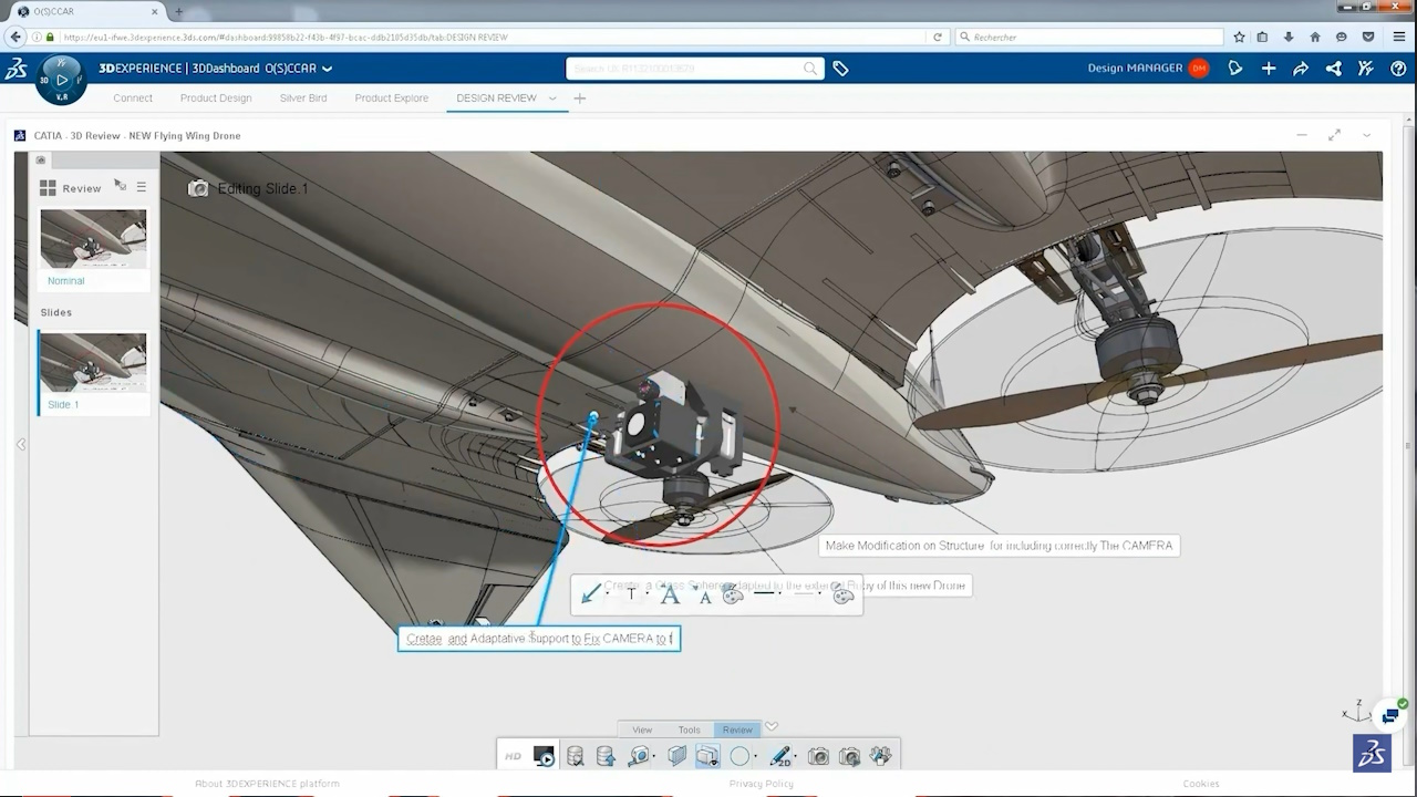 Menadžer sa mobilnog uređaja pregleda novi dron i komunicira dalje modifikacije sa timom. Ovde on koristi posebnu aplikaciju (Design Review). Zaokružuje pomoću nje deo sklopa gde dodaje tekstualni komentar - u ovom primeru da treba dodati staklenu poluloptu za zaštitu kamere i u skladu s tim izmeniti konstrukciju samog drona.
