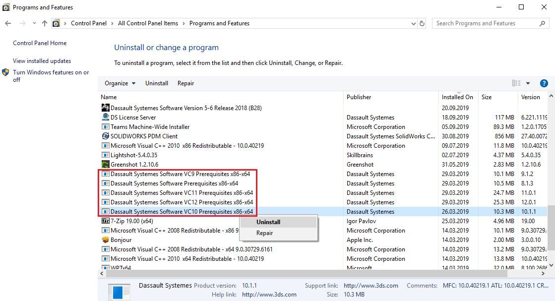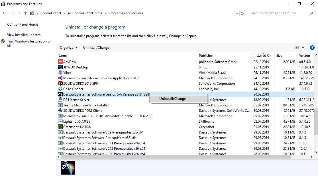 Kako bi započeli proces uninstall-acije Catia-e V5, potrebno je u Control Panelu pokrenuti Uninstall Program Windows aplikaciju. Zatim je potrebno pronaći DS License Server ikonicu i kliknuti desnim klikom na nju. Na novootvorenom pop-up prozoru potrebno je kliknuti Uninstall kao što je prikazano na slici iznad.