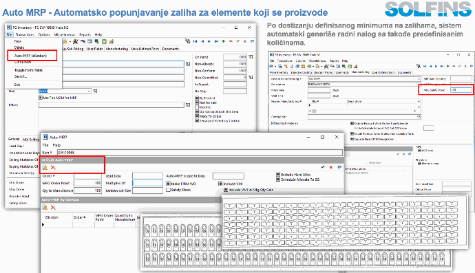 Auto MRP je mehanizam kojim DelmiaWorks automatski pokreće MRP analize i generiše predloge radnih naloga i Purchase Order-a na osnovu stanja zaliha, otvorenih porudžbina kupaca, forecast-a i definisanih MFG struktura i lead time-ova. U Auto MRP procesu centralnu ulogu ima Item master: za svaki artikal sistem koristi njegove MRP parametre (reorder point, safety stock, min/max, preferred vendor, lead time, MFG vs. Buy logika) i BOM strukturu kako bi odredio da li treba proizvoditi ili kupovati i u kom vremenskom horizontu. Kada odluči da treba kreirati PO prijedlog, Auto MRP koristi AKA buying i price break informacije da za izabrane dobavljače predloži količine i cene, dok za radne naloge koristi cost elemente i standardne cikluse iz BOM-a da proceni opterećenje kapaciteta i buduće troškove.