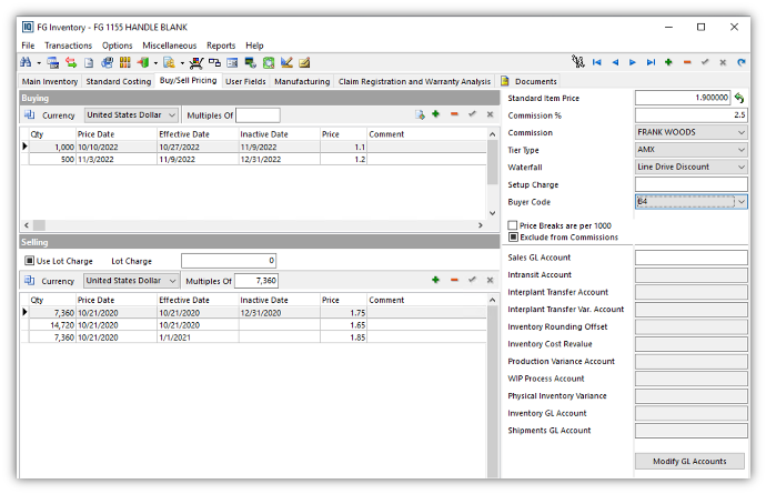 AKA buying radi isti posao na strani nabavke – omogućava da se za naš interni artikal vežu dobavljačev part number, merenje, cenovni uslovi, količinski popusti (price breaks), valute i VMI lokacije, po svakom dobavljaču posebno. U okviru AKA buying taba podešava se za koje dobavljače, od kog datuma i od koje količine važi određena cena ili rabat, što Purchasing modulu i Auto MRP logici daje mogućnost da prilikom generisanja PO predloga izabere ne samo pravog dobavljača, nego i tačan cenovni nivo prema količini. Za firme koje imaju veliki broj cena po kupcima i dobavljačima, AKA sloj postaje centralno mesto za upravljanje tim odnosima, dok Item master čuva „osnovne“ interne informacije.