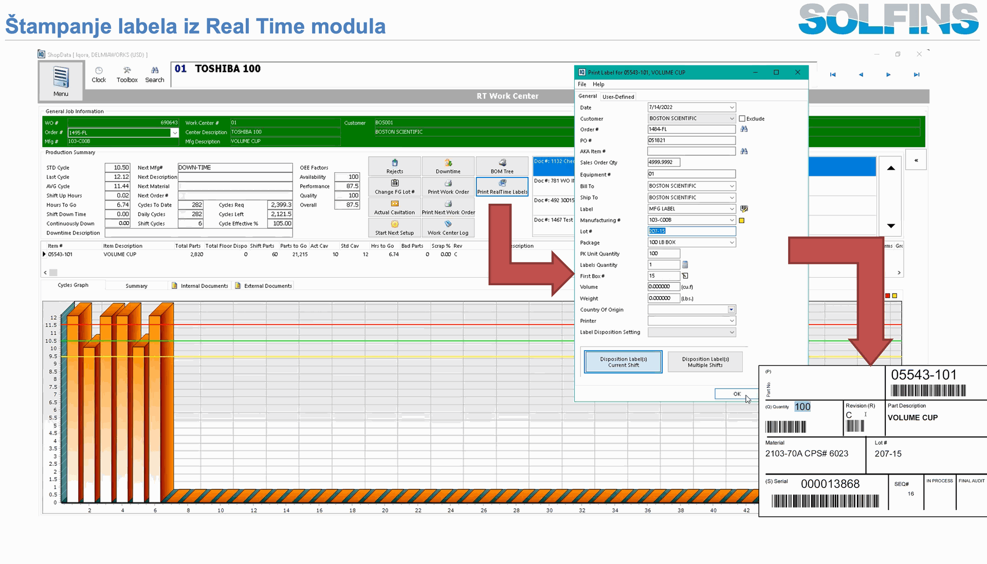 Production control nije samo prijava dobrih komada, već i disciplinovano upravljanje škartom i zastojima. Kroz ShopData „Rejects“ ekran operater može za svaki aktivan nalog da prijavi škartirane komade, odabere reason code (po BOM‑u, po radnom centru ili globalne kodove), po potrebi dodeli lot, lokaciju ili non‑conform lokaciju i, ako je potrebno, automatski generiše etikete za neispravne serije. Ove informacije ulaze u tabelu rejects i kasnije se mogu analizirati po artiklu, alatu, radnom centru ili uzroku, dok RealTime i Floor Disposition obezbeđuju da se ukupna proizvodnja i škart uvek slažu sa brojem ciklusa i stanjem u zalihama.