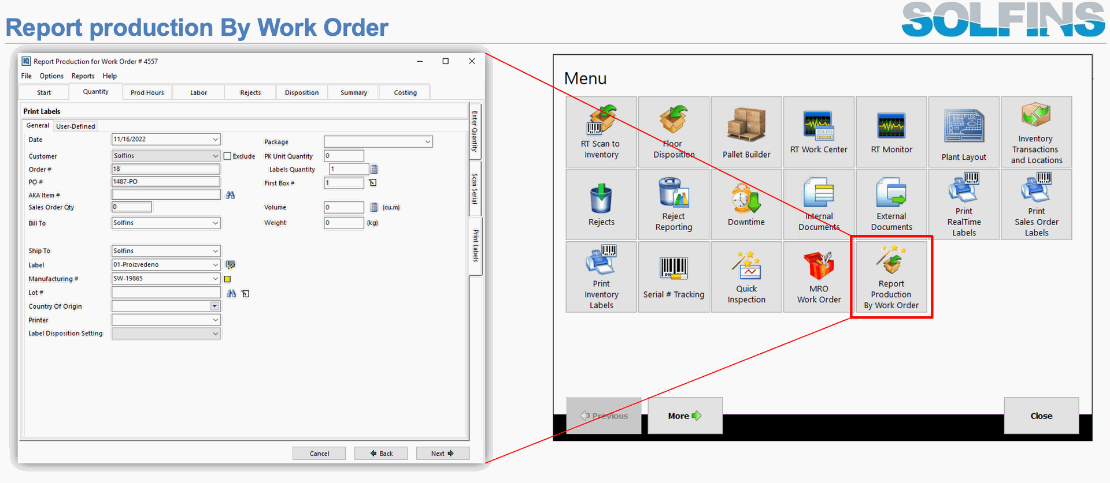 Serialized Label Printing je osnova za praćenje svake kutije, palete ili pojedinačnog komada kroz ceo tok – od proizvodnje, preko magacina, do isporuke i eventualnog povrata. Kada je artikal označen kao Serialized Inventory Control, sistem zahteva štampu etiketa sa serijskim brojem prilikom prijema, proizvodnje (Floor Disposition, RT Scan to Inventory, Pallet Builder) i otpreme, tako da svaka transakcija u inventaru i proizvodnji radi sa konkretnim serijskim brojem, a ne samo sa količinom. Etikete se mogu štampati iz više tačaka – Receiving, Production Reporting, RealTime Labels, Pallet Builder, RMA, Pick Ticket/Shipping – uz podršku za serijsku štampu (range), repakovanje (Repack by SN), reprint i kontrolu dimensionalnih karakteristika kada je to potrebno (npr. težina, dimenzija).