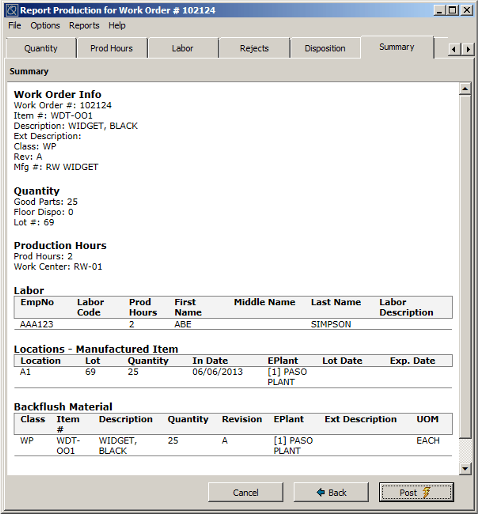 Ključni korak u kontrolisanju proizvodnje je „Floor Disposition“ – trenutak kada se proizvedeni delovi sa radnog naloga formalno prebacuju na zalihe, uz paralelno razduživanje sirovina. U standardnom scenariju, RealTime ciklusi pune proizvodni izveštaj (production report), a Floor Disposition određuje koliko komada ulazi u koju lokaciju, sa kojim lotom i serijskim brojem, uz automatski razduživanje (backflush) sirovina prema BOM‑u i parametrima u Production Reporting modulu. Ako se koristi RT Scan to Inventory, operater praktično samo skenira serijski broj sa etikete, a sistem zna koji radni nalog, koja stavka stoji iza tog serijskog broja i automatski odrađuje transakcije u zalihama.