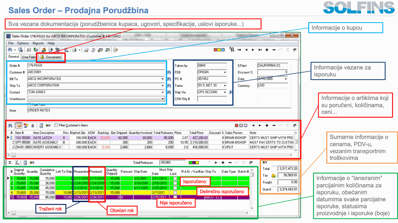 Sales Order forma je podeljena na tri dela: zaglavlje (Header), stavke (Line Item Details) i Releases/Delivery dates sekciju. U zaglavlju se definišu kupac, Bill‑To, Ship‑To, PO broj, valute, uslovi plaćanja, Ship Via, FOB, kampanja, CRM quote/opportunity reference, kao i ključne opcije poput Ship Complete, Drop Ship, Make To Order, Workflow Approval, itd. Stavke sadrže artikle, blanket quantity, UOM, cenu, rabat, provizije, status (On Hold, Ship Hold, MTO, Drop Ship, Sample), linkove ka BOM/MFG, Non‑Committed i On Hand stanje, podatke o količinama isporučenim i fakturisanim i razne user‑defined i referentne kodove. Donji deo ekrana – Releases – čuva pojedinačne isporuke po stavci sa Requested i Promise datumima, količinama, forecast flagom, expedite statusom, komentarima i informacijama za EDI, što je ključ za MRP i planiranje.