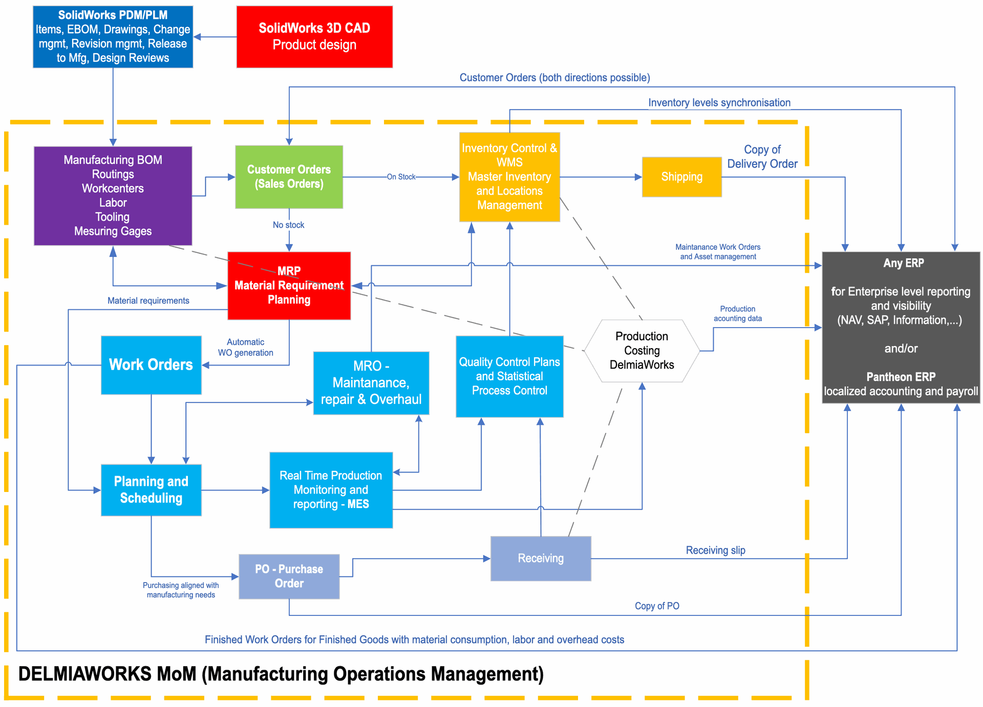 U DelmiaWorks‑u Manufacturing Configuration, Manufacturing Type, Manufacturing Cell, Center Type, Work Center i BOM su način da se realni procesi, mašine i linije fabrike prevedu u digitalni model na kome rade MRP, Work Orders (radni nalozi) , RealTime i costing.