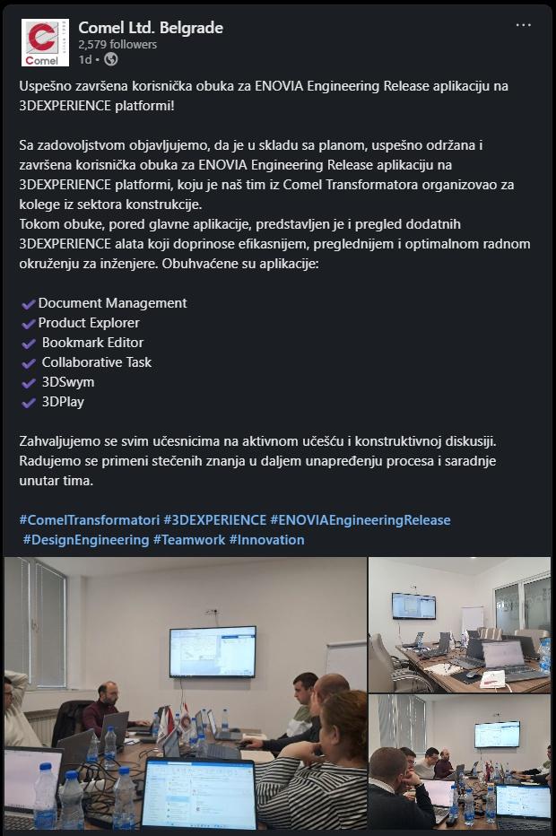 Sa zadovoljstvom objavljujemo, da je u skladu sa planom, uspešno održana i završena korisnička obuka za ENOVIA Engineering Release aplikaciju na 3DEXPERIENCE platformi, koju je naš tim iz Comel Transformatora organizovao za kolege iz sektora konstrukcije.