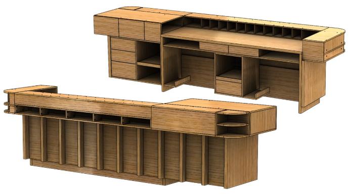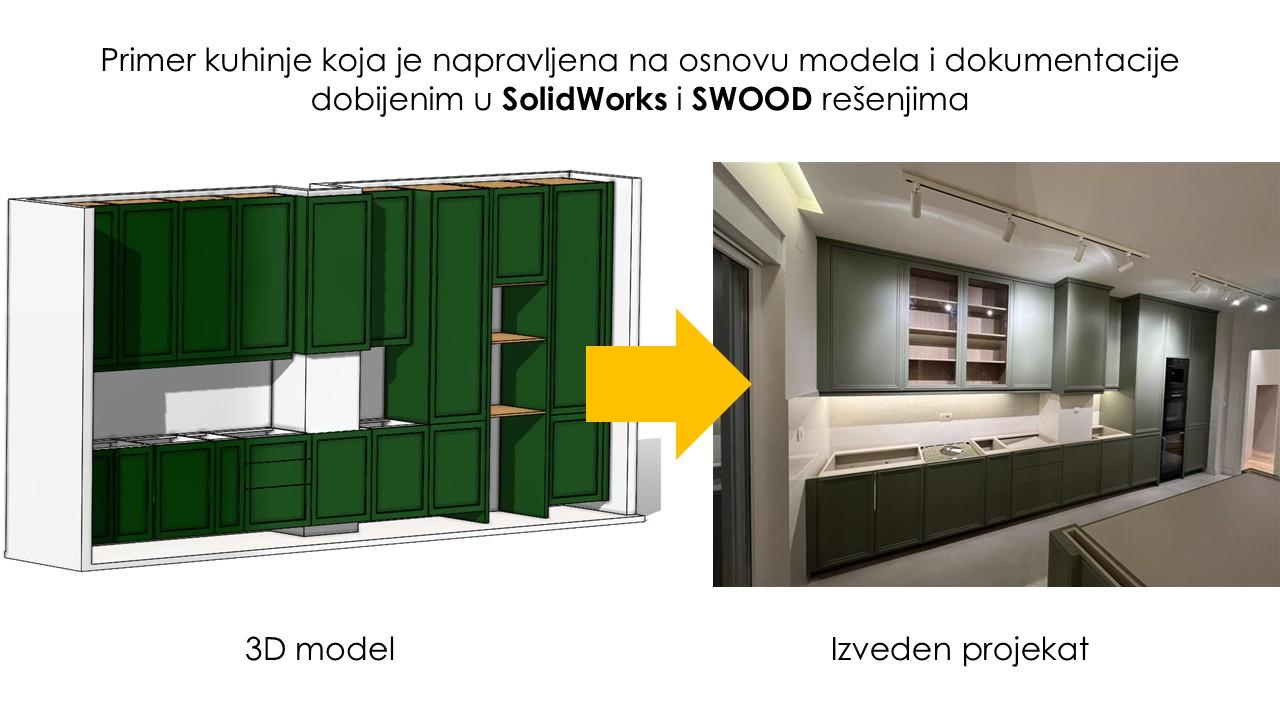 Slika: Kompletno definisan 3D model u SolidWorks i SWOOD softveru lako se pušta u proizvodnju i isporučuje na montažu zahvaljujući neprekinutom lancu prenosa informacija u kom se svaka izmena automatski ažurira i prenosi iz 3D CAD, u CAM za CNC proizvodnju, u dokumentaciju za montažu, u vizuelizaciju, itd.