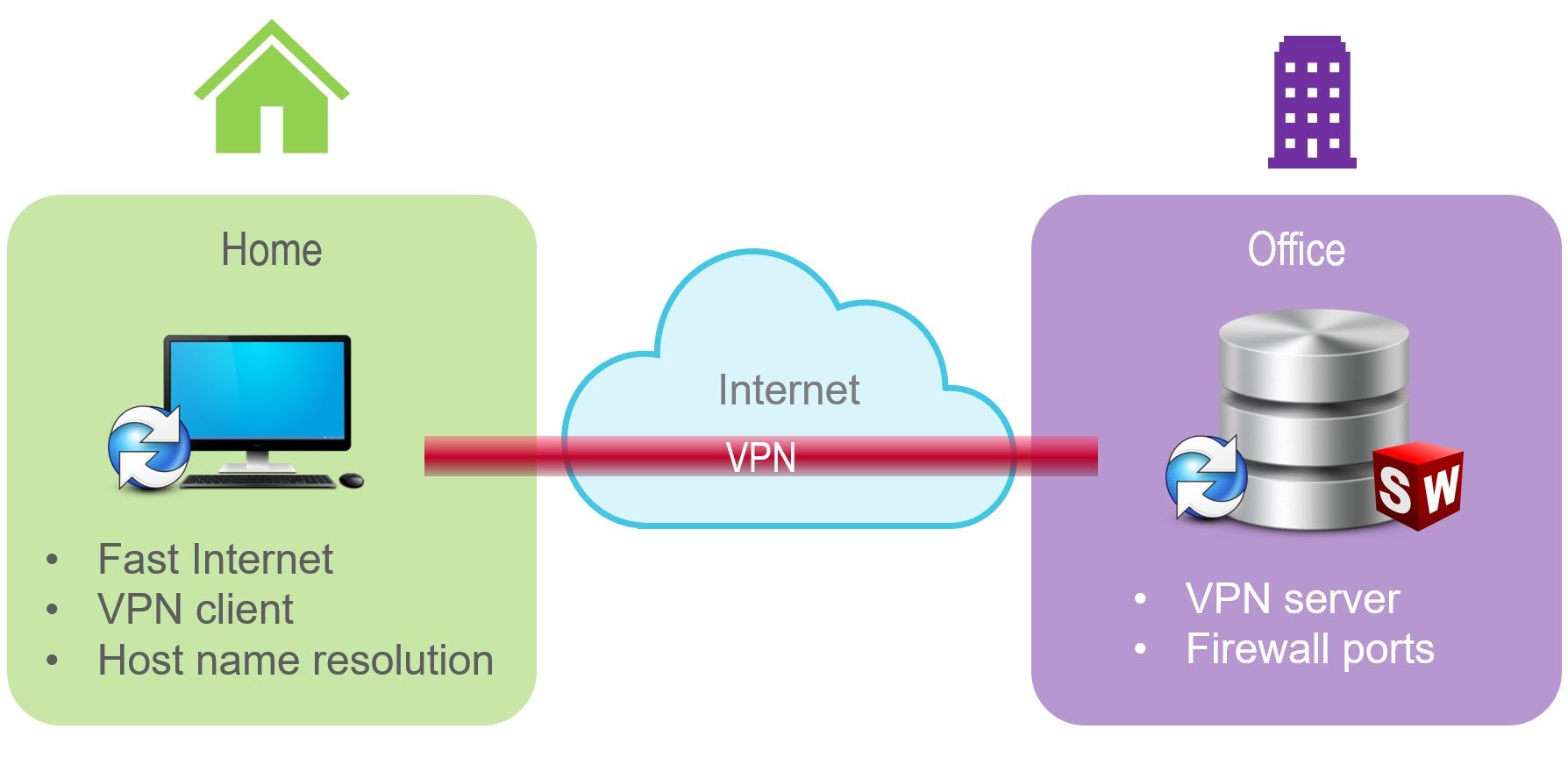 VPN Vam omogućava da kreirate virtualnu, šifrovanu vezu od kućne do kancelarijske mreže. Ovo u praksi znači da sa Vašeg kućnog računara možete videti internu mrežu Vaše kompanije pa samim tim uspostaviti vezu sa svim uređajima i serverima koji su Vam dostupni na računaru u firmi. U našem slučaju, za rad u PDM-u je neophodna komunikacija sa serverima na kojim su hostovani sledeći servisi (PDM baza podataka, PDM arhiva i SolidNetwork Manager za dodelu licenci). U najvećem broju slučajeva ovi servisi su hostovani na jednom ili dva fizička/virtualna servera. VPN veza ima ograničenja po pitanju brzine pa se ne mogu očekivati performanse kao da ste u kancelariji. Brzina zavisi od paketa koji imate kod kuće i brzine internet linka u firmi. Internet paketi za krajnje privatne korisnike su gotovo u svim slučajevima asimetrični tako da im upload retko prelazi 10 Mbps. Ovo je najverovatnije i najveća brzina koju možete ostavriti putem VPN veze. Poređenja radi, brzina interne mreže u firmama je uglavnom oko 1000 MBps.