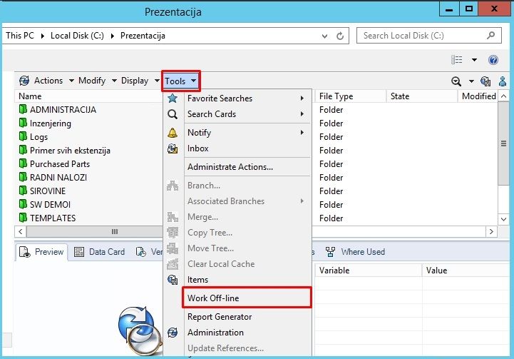 Ukoliko ne postoji način da uspostavite direktnu vezu sa PDM serverom sa svoje lokacije, ali imate svoju poslovnu radnu stanicu kod sebe, poslednja opcija bi bila da radite u PDM vault-u u offline režimu. Ovo će vam omogućiti da radite sa bilo kojim fajlovima koje ste prethodno odjavili u trenutcima kada ste imali aktivnu vezu sa serverom. Kada radite u offline režimu, možete uređivati sve fajlove koje ste prethodno odjavili, a sve keširane fajlove koji nisu odjavljeni možete isključivo pregledati.